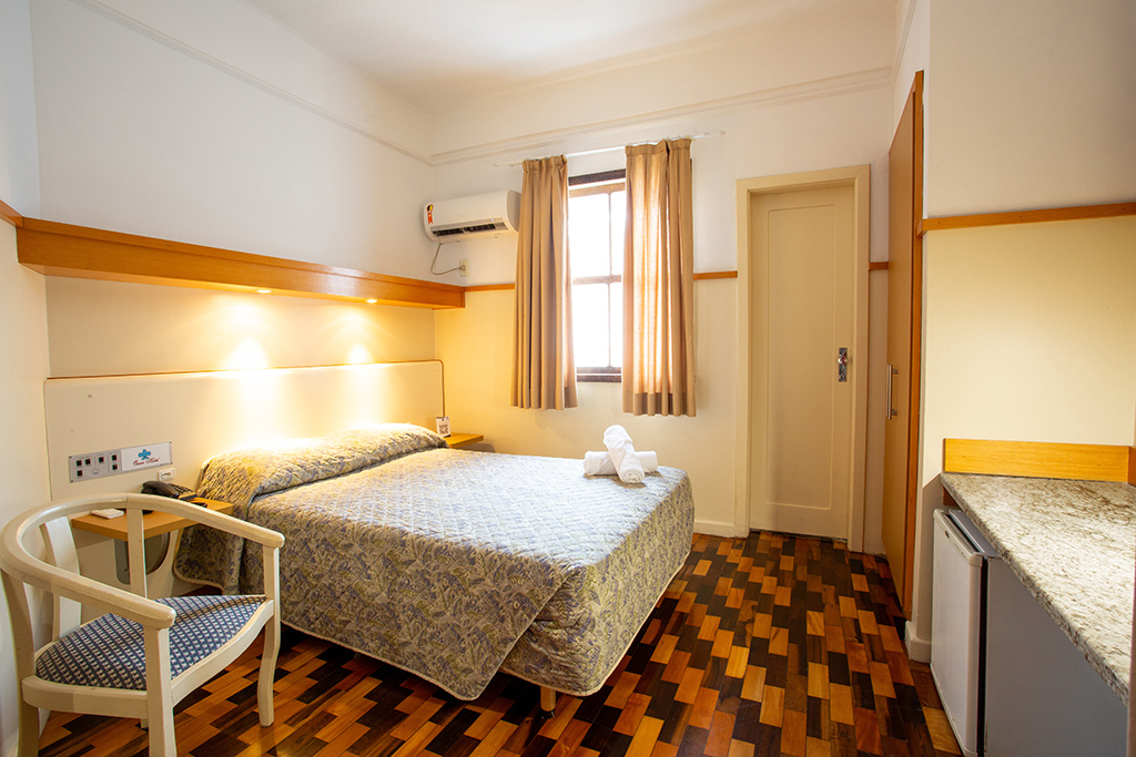Os quartos estão equipados com: mesa de estudos, tomadas 220W , internet wireless e com cabo, TV, frigobar, cofre individual, telefone, cama de casal do tipo Box, banheiros práticos e higiênicos, toalhas da Teka e roupas de cama da Altenburg.
