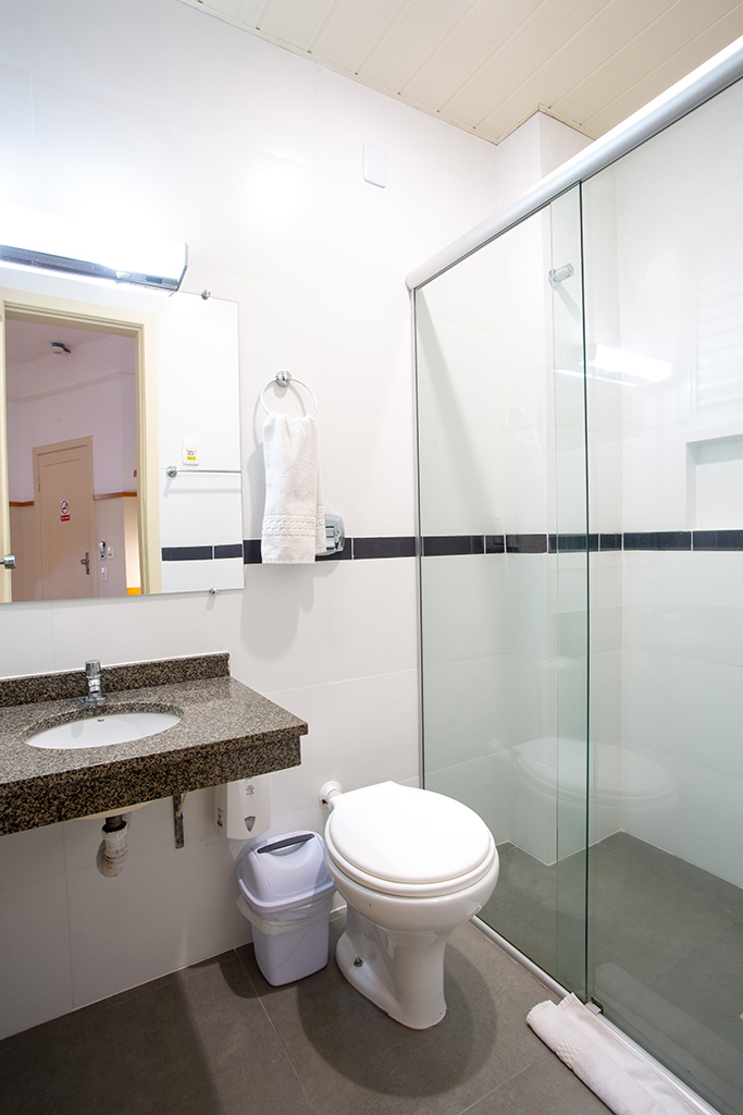 Nossos quartos são confortáveis e práticos. Possuem sistema de painel de cabeceira por meio do qual é possível controlar os comandos de disposição de lâmpadas, TV, ar condicionado, luz de cabeceira.